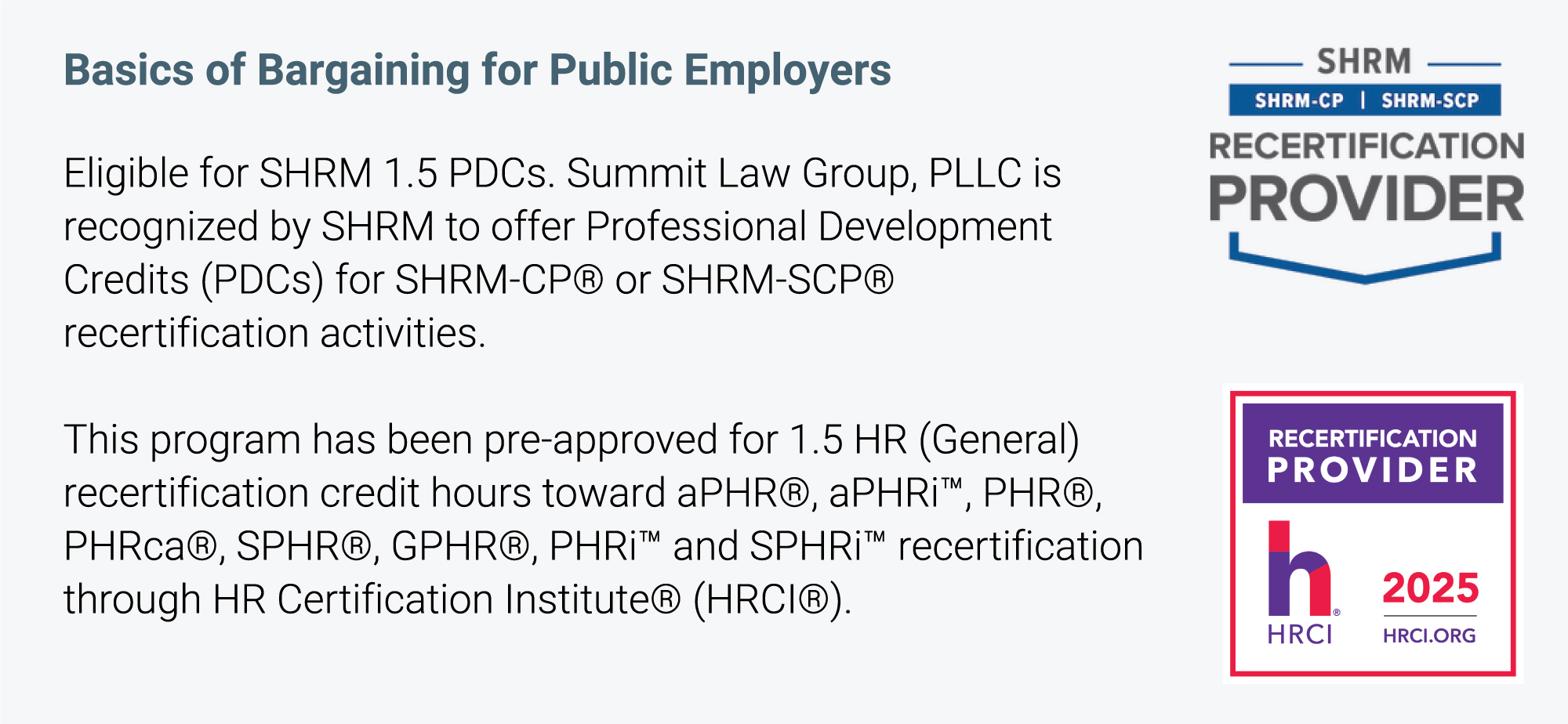 Training on basic legal concepts in working with represented employees and their bargaining representatives.